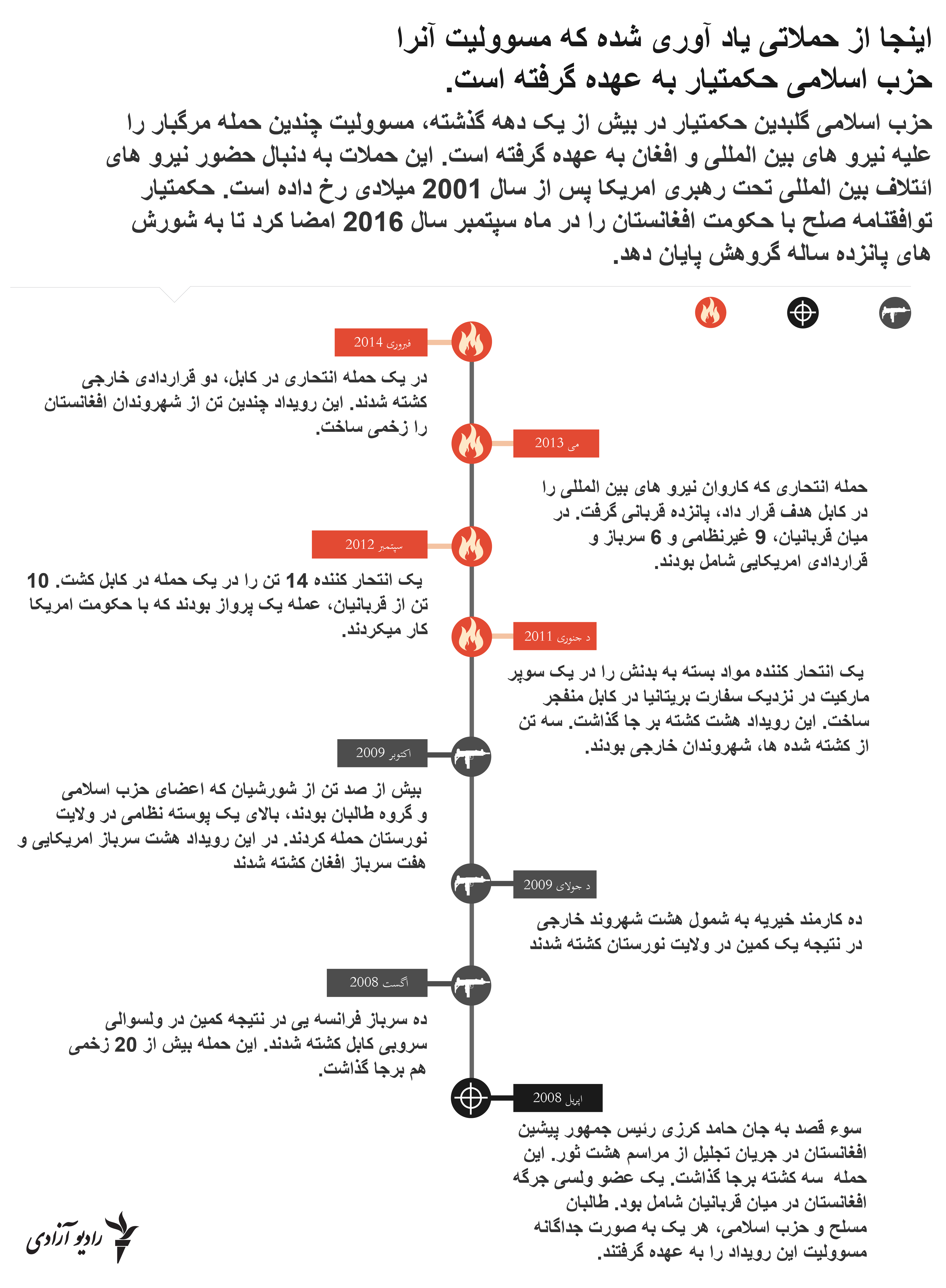برای مشاهده حملاتی که مسئولیت آنرا حزب اسلامی حکمتیار به عهده گرفته اینجا را کلیک کنید...